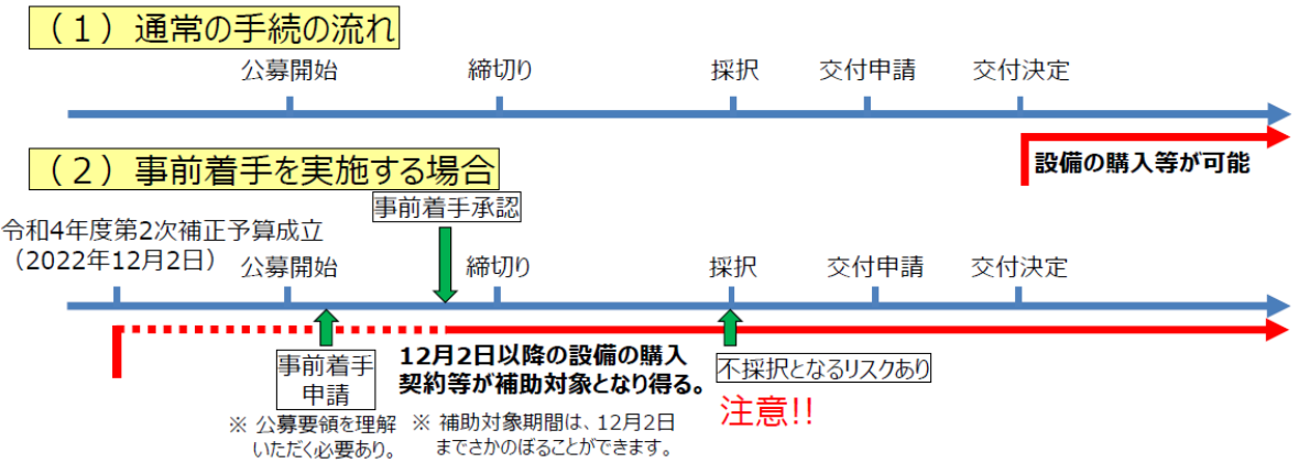 ・交付決定前に事前着手が承認された場合であっても、補助金の採択を約束するものではありません。また、採択された場合でも、補助対象経費については、交付申請時に認められたものに限りますので、公募要領をよくご確認ください 。