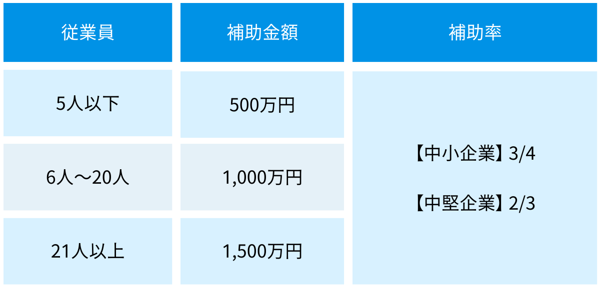 中小企業6人~20人、補助上限額1,500万円、補助率3/4、補助金額600万円、経費800万円と、補助率2/3、補助金額900万円、経費額1,350万円となり、経費額2,150万円以上が必要。