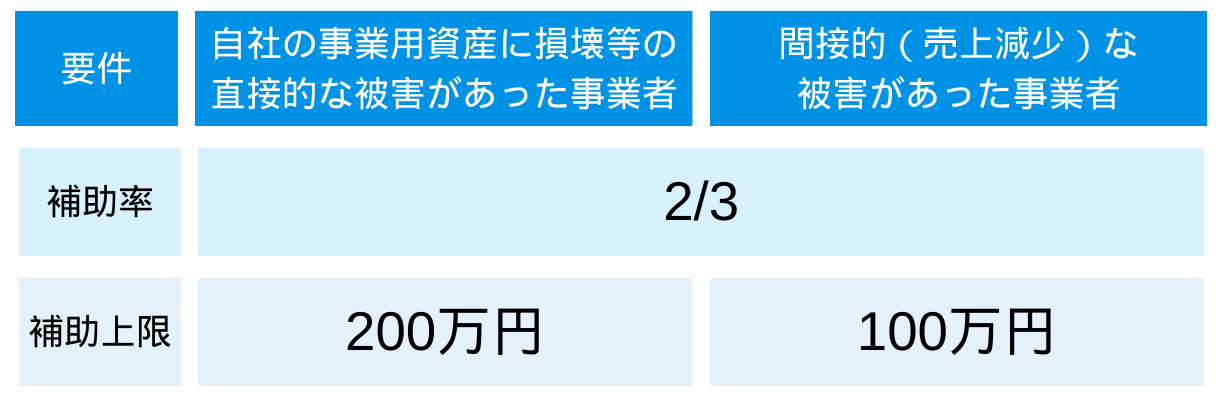 | 1.補助対象者 | (1)被災区域4県(石川県、富山県、福井県、新潟県)に所在する、小規模事業者。 ①自社の事業用資産に損壊等の直接的な被害を受けた事業者 ②令和6年能登半島地震に起因して、売上減少の間接的な被害を受けた事業者 |