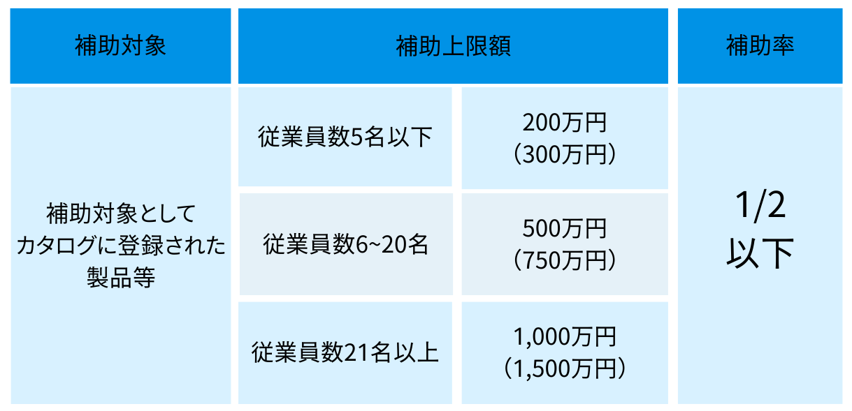 | 補助率等 | カタログに掲載された製品が補助対象となります。また、補助上限額は従業員数ごとに異なります。 |