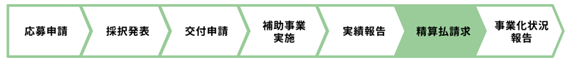 「補助金確定通知書」により通知された補助金額に基づき「補助金精算払請求書」を作成します。精算払の請求は、補助事業の確定検査を受け、かつ、補助金額の確定後でなければ行うことができません。請求書類に不備が無いことが確認できた場合は、8営業日程度で補助事業者名義の指定口座へ補助金を振り込まれますが、ご利用の金融機関の都合により多少前後する場合があります。