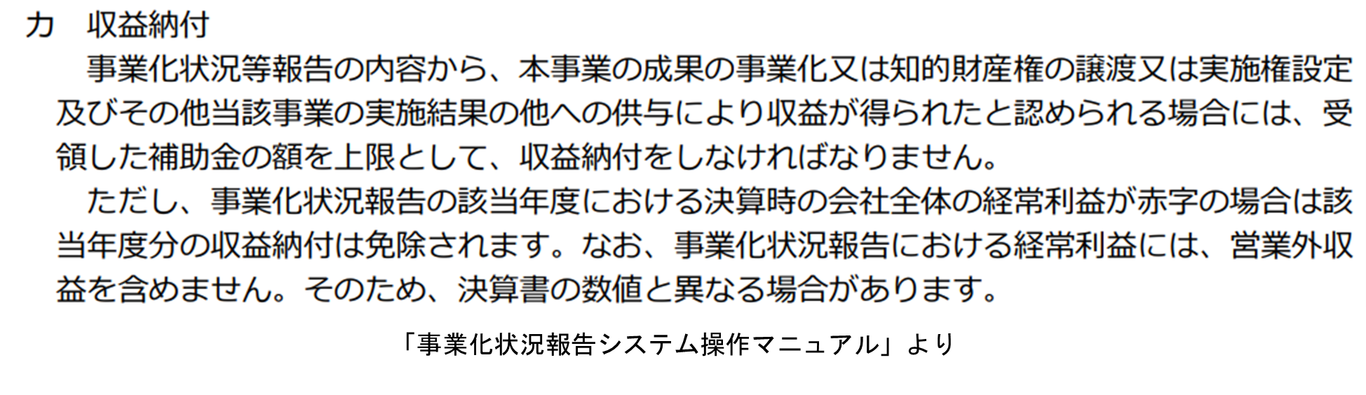 補助事業と利益との間に明確な因果関係がある場合は収益納付が発生する場合があることをご承知おきください。なお、因果関係が判明しない場合や、会社全体の経常利益が赤字の場合は免除されます。