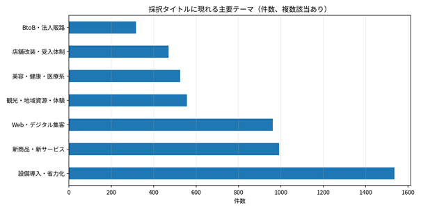 次に、採択タイトルのキーワードを基に主要テーマを集計すると、全体像はかなり明快です。最も多かったのは「設備導入・省力化」系で1,536件、続いて「新商品・新サービス」が992件「Web・デジタル集客」が962件でした。さらに、「観光・地域資源・体験」が557件「美容・健康・医療系」が525件「店舗改装・受入体制」が470件「BtoB・法人販路」が316件と続きます。ここで重要なのは、採択一覧の中心にあるのが広告単独案件ではなく、設備・商品・販路・受入体制が複合した案件だということです。