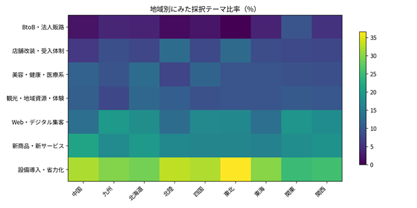 加えて、測量機器、赤外線ドローン、研磨装置、理美容複合機、厨房オペレーション改修など、設備投資案件も豊富です。ここでも重要なのは、設備が工程改善だけでなく、新サービス提供や新市場対応と一体化していることです。九州はWeb比率が最も高い一方で、設備投資も厚く、オンラインと現場改善を同時に走らせる案件が採択されやすい地域だといえます。