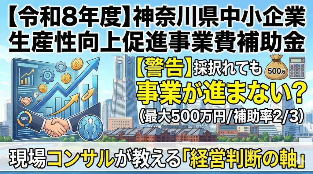 ホーム 都道府県補助金 都道府県補助金 【令和8年度】神奈川県中小企業生産性向上促進事業費補助金~設備費・ITに投資(最大500万円/補助率2/3)わかりやすく解説 「補助金に採択されました」という連絡を受けたとき、経営者の方はどんな顔をされるでしょうか。私の経験では、採択の瞬間に心から喜べる経営者と、どこかほっとした顔をし… 2026年4月9日 都道府県補助金