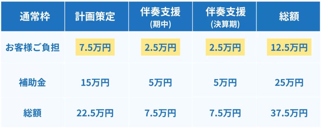 早期経営改善計画は、国の制度を活用することで、事業者負担として僅か12.5万円(税込)で作成することができます。